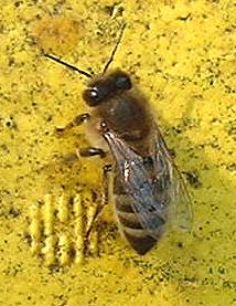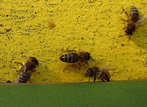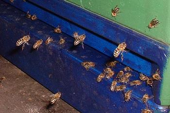 bei der Rückkehr in den Stock nicht direkt in den Stock einfliegen können oder bereits zu erschöpft sind, erstarren sie und sterben. Zahlreiche Bienen liegen daher vor dem Bienenstand.
