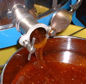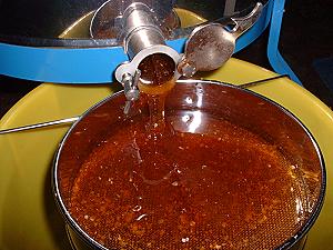Durch Zentrifugalkraft wird der Honig aus den Waben geschleudert und läuft durch ein doppeltes Sieb in den
