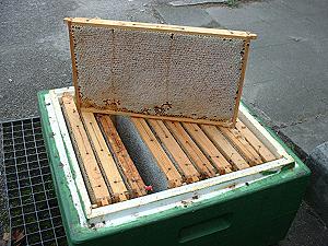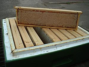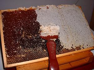 einer Gabel abgenommen, dann kann der Honig aus den Zellen herauslaufen (in der Schleuder).