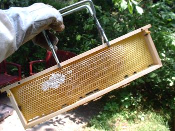 wird. Dabei muß man noch eine Handvoll Bienen von den Waben abfegen.