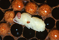 Verlusten. (Das Bild zeigt eine Milbe auf einer Drohnenpuppe.)